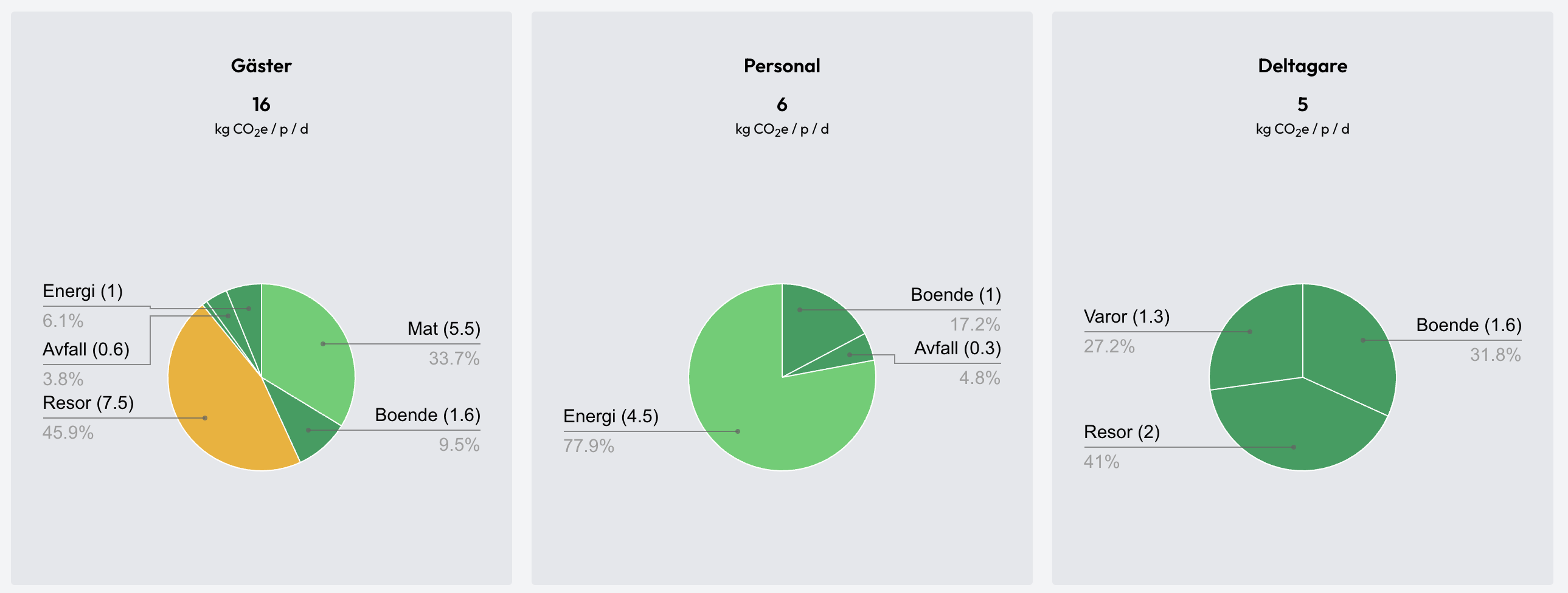 Analyze emissions for food, travel, lodging, waste, energy, procurement, and transport, and analyse emissions from guests, staff, and participants.
