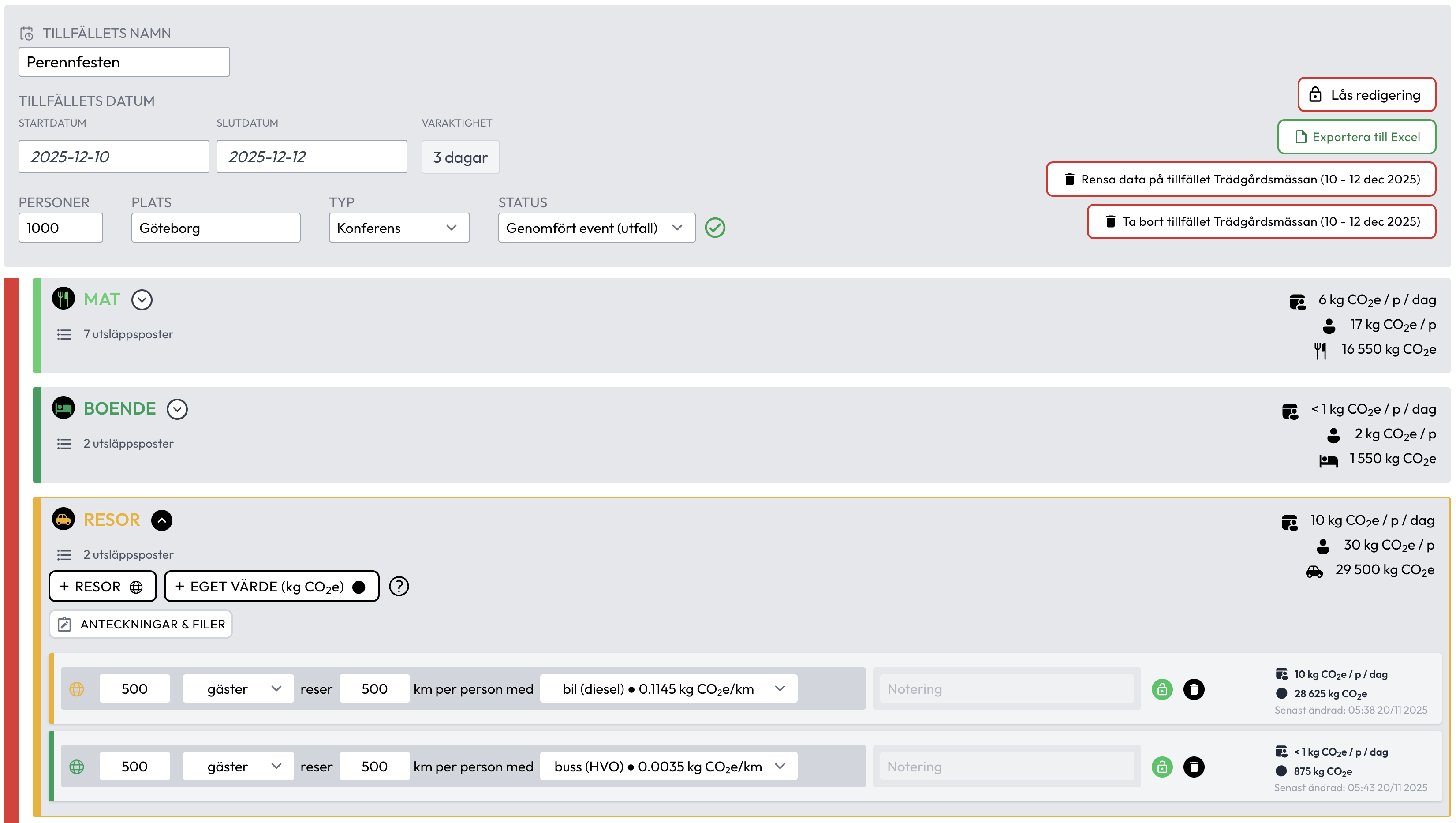 Compare emissions between different events and see how your climate impact develops over time.